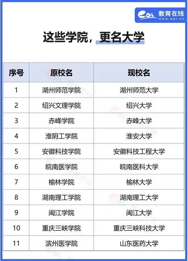 据统计,此次函件中11所正式更名为大学的学校分别是: