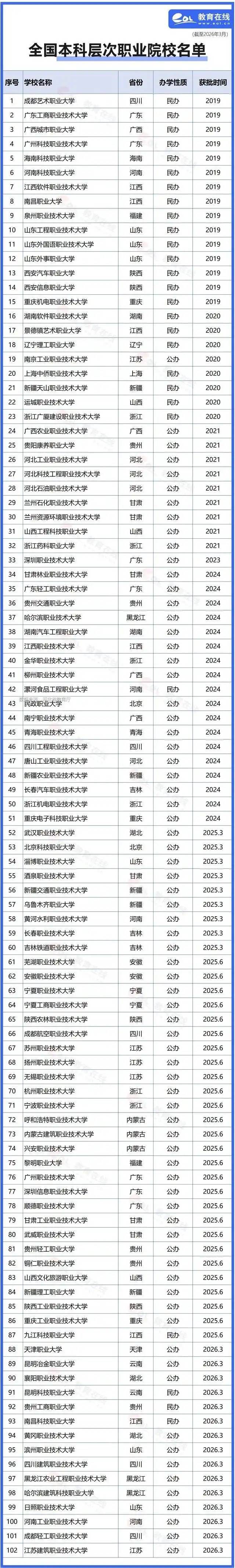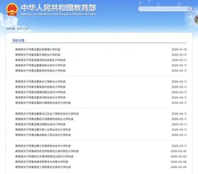 3月20日,教育部发布了一批同意高等学校设置的函,涉及26所高校。其中,11所学院正式更名为大学,新设15所职业本科高校。